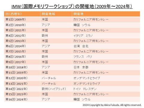 「国際メモリワークショップ(IMW)」は半導体メモリとその関連技術の研究開発に特化した国際学会であり、毎年5月中旬~下旬に開催されてきた。開催地は隔年で米国(モントレー)、米国以外の年は欧州とアジアで交互開催というのが慣例となっている。最近では西暦の奇数年が米国、西暦の偶数年が欧州あるいはアジアで開催されてきた。欧州とアジアはそれぞれ4年ごとの開催となる。