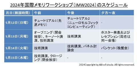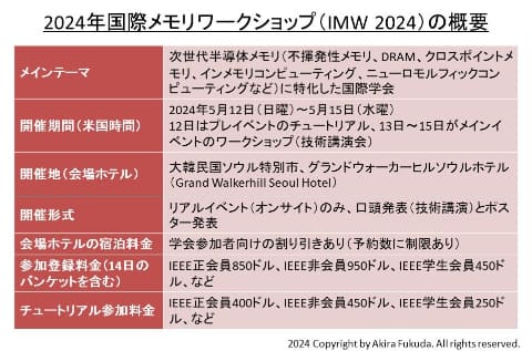 半導体メモリ技術の研究開発に関する国際学会「国際メモリワークショップ(2024 IEEE 16th International Memory Workshop(IMW 2023))」が、2023年5月12日~15日に大韓民国(韓国)ソウル特別市で開催される。