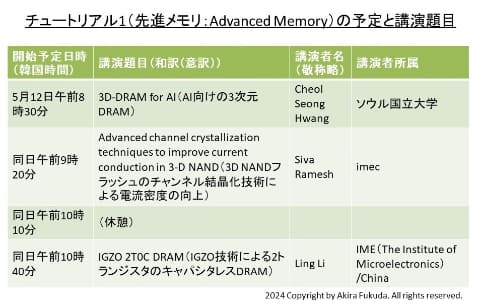 「チュートリアル1」の共通テーマは「先進メモリ(Advanced Memory)」である。「AI向けの3次元DRAM技術」、「3D NANDフラッシュメモリ技術」、「キャパシタレスDRAM技術(次世代DRAMの候補技術の1つ)」の講演を予定する。