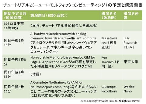 「チュートリアル2」の共通テーマは「ニューロモルフィックコンピューティング(Neuromorphic Computing)」である。「アナログメモリを利用したAIハードウェアアクセラレータ」、「エッジAI応用を想定した不揮発性メモリベースのアナログコンピューティングインメモリ(CiM)」、「抵抗変化メモリのニューロモルフィックコンピューティング応用」の講演がある。講演時間はいずれも50分となっている。