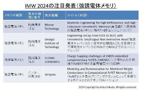 「強誘電体メモリ」分野では、高性能かつ長寿命の強誘電体メモリに向けた材料エンジニアリング技術をMicron Technologyが解説する(講演番号7.1、招待講演)。