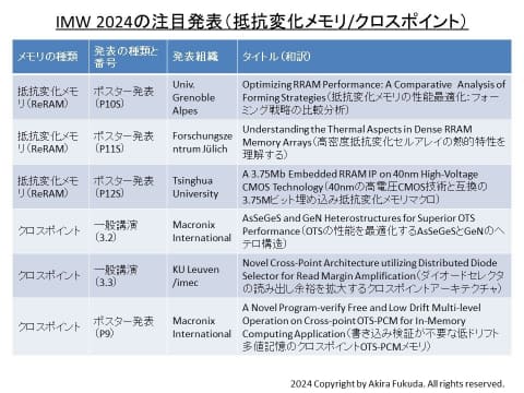 「抵抗変化メモリ/クロスポイント」分野では、40nmの高電圧CMOS技術と互換の3.75Mbit埋め込み抵抗変化メモリマクロをTsinghua Universityが発表する(ポスター発表番号P12S)。また、クロスポイントメモリに使われるOTSセレクタの性能を最適化するAsSeGeSとGeNのヘテロ構造をMacronix Internationalが開発した(講演番号3.2)。
