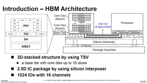 HBM用のDRAMダイは、1,024本(1,024bit)と広いシングルエンド伝送の入出力バスを備える。入出力バスが広くTSV電極を経由するので伝送距離が短く、広帯域伝送に適する。入出力ピンあたりのデータ転送速度は「HBM3」の場合に7~8Gbps、「HBM3E」の場合に10Gbpsである。ピン当たりが8Gbpsだと、モジュール全体のデータ転送速度は1,024GB/sに達する。