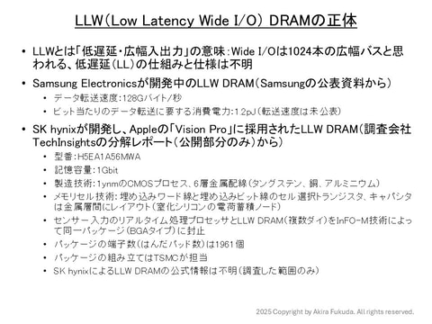 もう1つの表記であるLLW DRAMは、あまりなじみのない呼称である。Samsung Electronics(以降はSamsungと表記)がオンデバイスAI向け低消費電力DRAMのLLW DRAMを開発中だと2023年~2024年の時点で公表している(たとえば2024年1月9日付け)。目標仕様はデータ転送速度が128GB/s(第1世代のHBMと同等)、ビット当たりの消費電力(データ転送時、速度は不明)は1.2pJと低い。