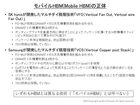 すでに述べたように、LLW DRAMはHBMとはまったく異なる技術だ。そしてモバイルHBMは、LLW DRAMとも従来のHBMとも異なるパッケージ技術である。SK hynixのVFOとSamsungのVCSはいずれも、HBM技術あるいはその類似技術とみなすことはできない。