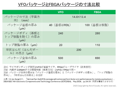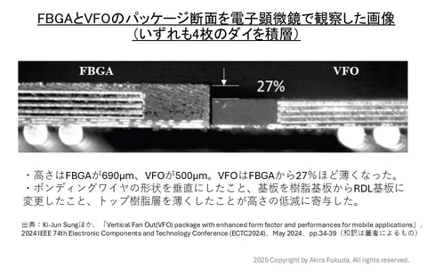 それでは、次世代DRAMパッケージの概要を説明していこう。始めはSK hynixの「VFO」である。試作したVFOパッケージは従来のFBGAパッケージと比べ、パッケージ全体の厚み(外部電極を含む)を27%ほど減らした。具体的にはDRAMダイの4枚積層でFBGAの厚みが690μm、VFOの厚みが500μmである。