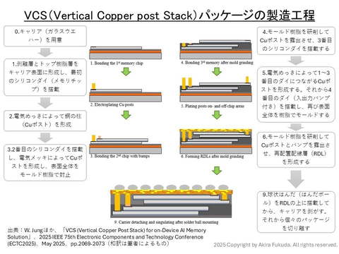 ただし、VCSには「2回のCu電気めっき」と「2回の樹脂封止」というコスト増加要因がある。シリコンダイの積層枚数が4枚程度と少なく、入出力数が比較的少ないDRAMであれば、製造コストではVFO技術がかなり有利だと思われる。