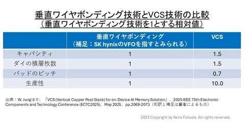 さらに、「垂直ワイヤボンディングによるパッケージ技術」とVCSパッケージ技術を比べて見せた。ここで「垂直ワイヤボンディングによるパッケージ技術」とは、SK hynixが開発している「VFO」を指すとみられる。キャパシティは1.5倍、ダイの積層枚数は1.5倍、パッドのピッチは0.7倍、生産性は10.0倍だとする。