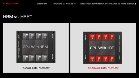 HBFを考案したのは、NANDフラッシュメモリおよびフラッシュストレージのサプライヤであるSandiskだ。入出力帯域はDRAMコアダイのHBMとほぼ同じであり、HBMに近いコストで記憶容量を8倍~16倍に拡大し、消費電力を大幅に減らせるとする。512GBモジュールの入出力データ速度は1.6TB/sと高く、DRAMコアダイの「HBM4」に近い。また外形寸法(平面サイズと高さ)は、「HBM4」モジュールとほぼ同じだとする。