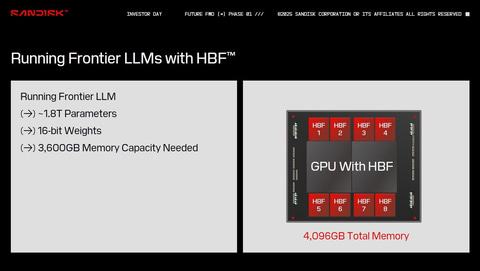 Sandiskは、人工知能(AI)関連の大手企業複数社から情報を収集してHBFのアーキテクチャを考案したとする。大規模言語モデル(LLM: Large Language Model)に代表される大規模なマシンラーニングモデルは、パラメータの数が極めて多い。たとえば16bitの重みで1.8兆(1.8T)のパラメータを格納するためには、3,600GBのメモリが必要となると同社は述べる。