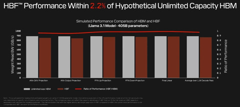 DRAMコアダイのHBMをNANDフラッシュメモリコアダイのHBFに置き換えた場合、推論性能はどの程度の低下に収まるだろうか。SandiskがLLM「Llama 3.1(4,050億パラメータ)」を例に推論処理のいくつかのステップで比較した結果、HBFはHBM(記憶容量は無限に大きいと仮定)に比べて2.2%未満の性能低下に留まったとする(GPUは同じ)。