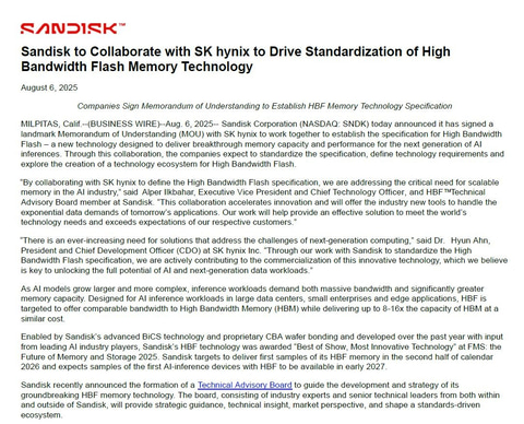 HBFの開発と仕様策定にあたっては、SK hynixがSandiskに協力する。SK hynixはDRAM大手であるとともにNANDフラッシュメモリ大手でもあり、HBMの最大手サプライヤでもある。HBFにはTSV技術が欠かせない。SandiskはTSV技術の量産実績を持たないので、同じくTSV技術を採用するHBMの量産実績があり、なおかつNANDフラッシュメモリに明るいSK hynixは最適なパートナーだとも言える。