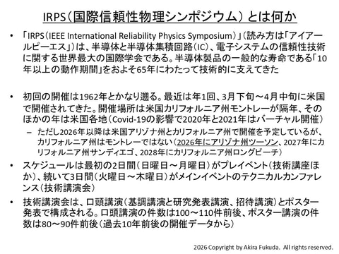 半導体デバイスの信頼性技術に関する世界最大の国際会議「国際信頼性物理シンポジウム(IRPS: IEEE International Reliability Physics Symposium)」が2026年3月22日~同年3月26日に米国アリゾナ州ツーソンで開催される。