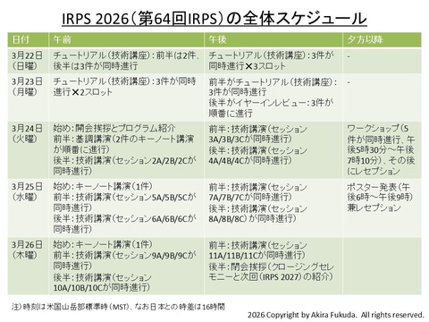IRPSの基本的なスケジュールは5日間で、日曜日から木曜日までを予定する。日曜と月曜の2日間は技術講座(チュートリアル)とイヤーインレビュー(前年の技術的な進展を振り返る講演: 「最近の話題」と以降は表記)で構成される。今年(IRPS 2026)は23件のチュートリアルと3件のイヤーインレビューを予定する。チュートリアルの件数は前年(IRPS 2025)の20件から3件増えた。イヤーインレビューの件数は3件で、前年と変わらない。