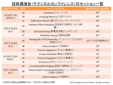 メインイベントである技術講演会(テクニカルカンファレンス)は火曜日から木曜日までとなる。今年は4件の基調講演、105件の一般講演、6件の招待講演、95件のポスター発表を予定する。一般発表の合計(一般講演とポスター発表の単純合計)は200件となり、前年(IRPS 2025)の189件から増加した。なお一昨年(IRPS 2024)の一般発表は159件だった。