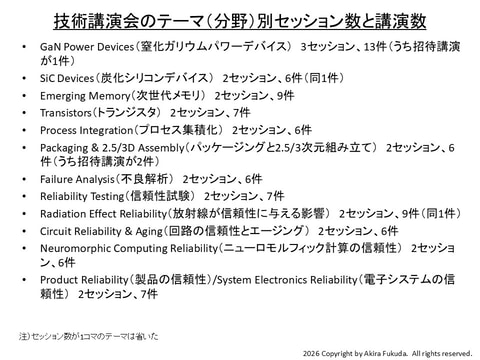 セッションが2つあるのはSiCデバイス、「次世代メモリ」「トランジスタ」「プロセス集積化」「パッケージングと2.5/3次元組み立て」「不良解析」「信頼性試験」「放射線が信頼性に与える影響」「回路の信頼性とエージング」「ニューロモルフィック計算の信頼性」「製品/電子システムの信頼性」である。