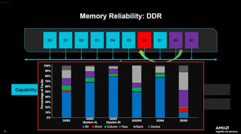DRAMユーザーであるAMDの実績データでは、過去にDDR2世代からDDR4世代のDRAMで発生した不良(修正前不良)の50%~80%はビット不良(マルチビットの不良を含む)だった。ECC機能を備えたDDR系DRAM主記憶は、不良率の低減に大きく寄与したことが分かる。