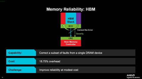 誤り訂正機能を備えながらもコスト増分がDDR系DRAMサブシステムよりも低い広帯域DRAM製品が、HBM(High Bandwidth Memory)である。HBMはオンダイECC機能を搭載しており、誤りが発生するとデータを修正するとともに誤りの重要度(Severity)をメモリコントローラに送信する。コスト増分は18.75%で、DDR系DRAMサブシステムのECC機能よりも少ない。