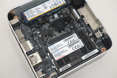 CPU側にファンを搭載するのはもちろんのこと、メモリ/SSD側にもファンを搭載し、安定動作を図っている。また、CPU側にはTDP 65Wの熱を迅速かつ効率的に伝導する相変化材料、2本の純銅ヒートパイプを採用。高負荷時でも動作温度を86℃以下、騒音レベルを45dB未満に抑えたという。実際、ベンチマーク中の音も大変静かであり、アイドル時は静かな深夜でも集中しなければ分からない程度に抑えられていた。