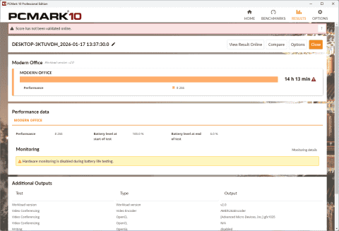 「16型パネル採用で軽く、比較的高性能」ということで実は個人的に一番懸念していたのがバッテリ。本製品では60Whバッテリの採用がうたわれているが、容量的にみれば確かに心許ない。そこで、輝度を35%に設定して、キーボードバックライトをオフ、電源プランをバランスに設定したうえで、PCMark 10のModern Officeで計測してみたところ、残り6%までなんと14時間13分も駆動してしまった。完全に予想外である。これなら、作業内容によっては1日8時間程度、外で仕事していてもACアダプタを持ち運ぶ必要がなさそうだ。