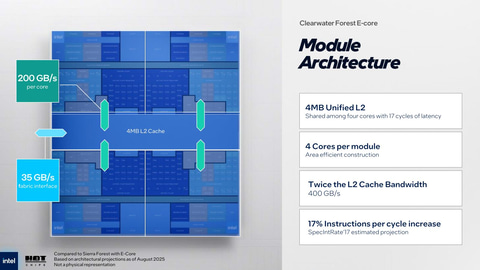 そのClearwater ForestのEコアについて、フロントエンド(スライド3)とアロケート/イシュー(スライド4)、実行(スライド5)とメモリサブシステム(スライド6)の構造は、後でもう少し詳細に見てみたいが、基本はTremont以降のEコアの構造をそのまま継承したものだ。Sierra Forestでは、Tremontに小改良を施したCrestmontコアが搭載されていたが、Clearwater ForestはCrestmontとは若干異なり、むしろLunar Lakeで搭載されたSkymontに近い気がする。