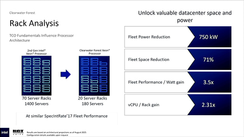 2日目にあたる8月25日がカンファレンスデー初日で、ここのCPUセッションでIntelは「Clearwater Forest(開発コードネーム)」の詳細を公開したのだが、「あれ?」と思うことがあったので、ちょっとこの話をしたいと思う(上の写真)。