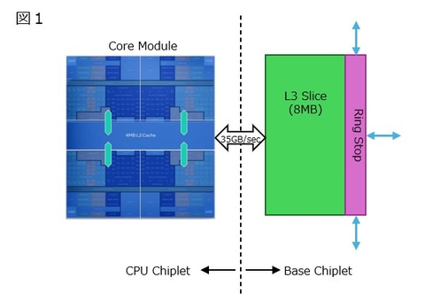 考えられる構造は図1のように、各コアモジュールの共有L2と8MBのL3スライスが直接接続される形になっており、そのL3スライスの先にリングストップがあって、そこからメッシュでL3スライス同士が接続されるという構造だ。