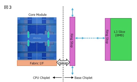 ただ今回の場合話が厄介なのは、コアモジュールの搭載されたチップレットと、LLCの搭載されたチップレットが別のものになっているということだ。先にスライド7の脚注で「35GB/sで足りるのか?」と書いたわけだが、それはここに絡んでくる。