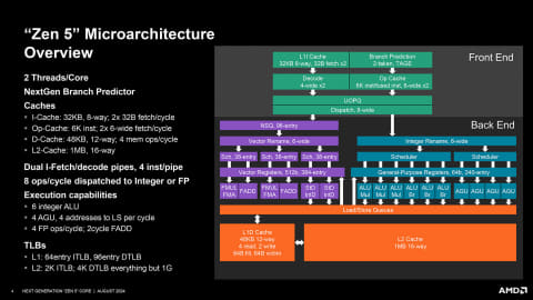 図3は昨年のHot Chipsで説明された、Zen 5の内部構造である。フロントエンド(Front End)の最後、MicroOp Queue(キュー)の下には明確に「Dispatch 8-wide」と書かれているのがお分かりかと思う。