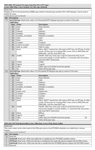 面白いものとしては、今回PMCx00F(FP packed 512 uops retired by FP or INT type)およびPMCx013(FP NSQ Read Stalls)が追加されたことが挙げられる(図5)。