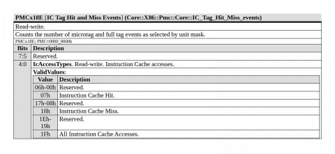 PMCx00F、PMCx013はともにZen 5世代に存在しなかったことが不思議ではあるのだが、単にいろいろ追いついていなかったのかもしれない。PMCx00Fは512bit動作(つまりAVX512動作モード)における動作をモニターするもの、NSQはNon-Scheduled Queueの状態をモニターするもので、どちらもZen 6以前から搭載されているものである(512bit幅のAVX512動作はZen 5世代で実装されている)。逆にPMCx18E(IC Tag Hit and Miss Events)(図6)はなぜかZen 6では落とされている。