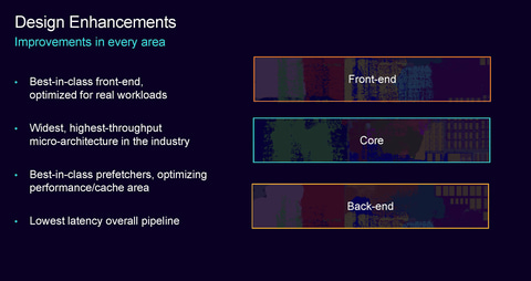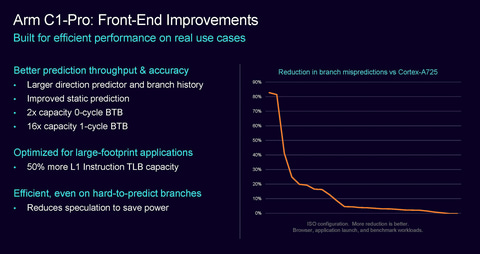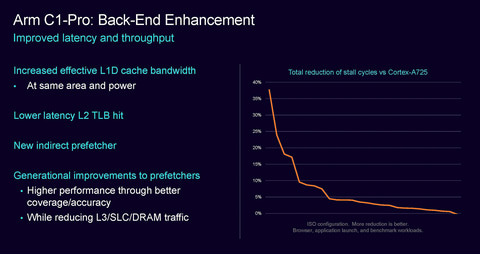 C1-Proも、フロントエンドとバックエンドの改良が顕著。フロントエンドでは分岐予測のスループットや正確性の向上、L1命令TLBの50%増量、さらには分岐予測時の電力削減などが実現されている。バックエンドではL1データキャッシュの帯域幅の増加、新しいインダイレクトプリフェッチャなどの導入より、L3キャッシュやDRAMとの混雑回避などが可能になっている。