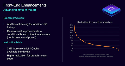 一方、C1-Ultraのフロントエンドでは主に分岐予測の精度を高める改良が加えられている。具体的には分岐予測の過去の履歴などをより詳細分析し、それにより正確性を上げることで性能や電力効率などを改善している。また、L1命令キャッシュの帯域幅が33%増加したことで、命令とのフェッチをより高速に行なうことが可能になる。