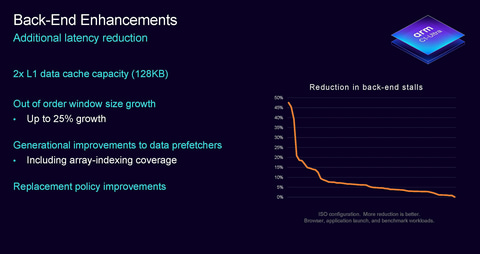 バックエンドでは、L1データキャッシュの容量が従来までの64KBから128KBに増えている。これまでキャッシュ容量はCortex-X1からCortex-X925までの5世代にわたって、データ64KB、命令64KBの合計128KBとなっていたが、C1 Ultraではデータが128KBに層化して、合計192KBになっている。
