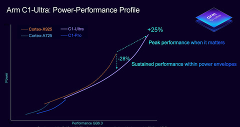 こうした改良により、従来世代と比較してピーク性能は25%向上し、同性能であれば消費電力は28%減少しているという。すなわち、電力効率が向上しているのがC1-Ultraのメリットとなる。