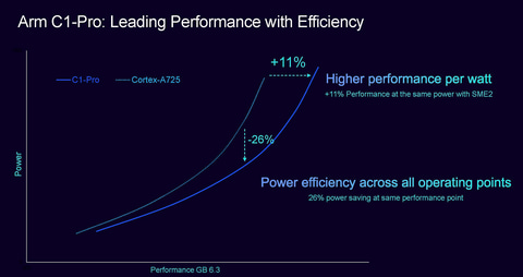 こうした強化により、Cortex-A725と比較して性能では11%の向上、同じ性能であれば26%の消費電力削減を実現している。