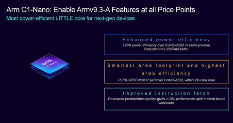 C1-Nanoは、FP/SIMDユニットを拡張しているほか、L3/DRAMへのアクセス混雑を21%削減するなどして実行効率を高めており、電力効率をA520に比べて26%改善している。