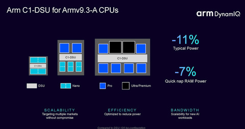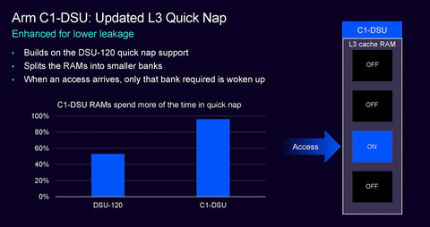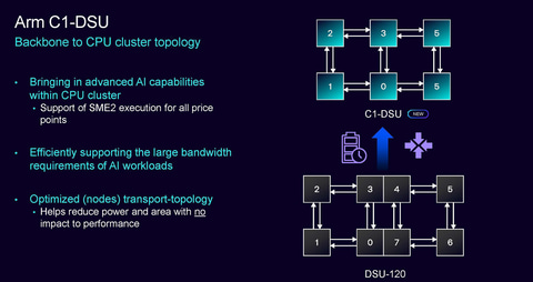 さらに、こうしたC1シリーズのチップ間インターコネクトとなる「C1-DSU」は、前世代のDSU-120と比較して、CPUのクラスタトポロジー(接続方法)やL3キャッシュの搭載方法を変更しており、性能に影響を与えずに消費電力を削減することに成功している。