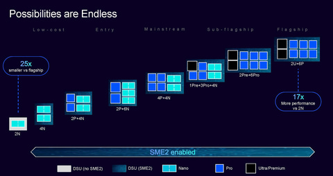 Armが示した例では、C1-Nanoの2コアという最小構成から、C1-Ultra 2コアとC1-Pro 6コアによる8コア構成など、さまざまな構成が紹介されており、伸縮可能なアーキテクチャになっていることも大きな特徴だ。この場合だと前者に比べて後者は17倍の性能を発揮できるという。
