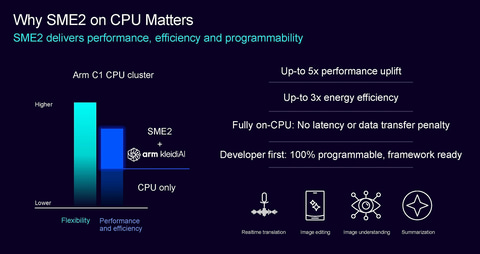 ではなぜArmのCortexでは、第1世代のSMEに対応してこなかったのだろうか。Armによれば「SMEはどちらかと言えばHPC/AI学習に特化したような拡張命令になっており、クライアント向けのCortexには必要ないと判断してきた。しかし、SME2ではAI推論に対応した命令セットが追加されており、クライアント向けのCシリーズに実装する意味があると判断した」と説明する。