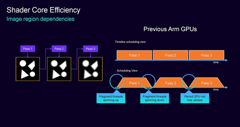 ただし、シェーダー内部の実行効率を高める最適化は続けられており、新しく導入された「Image Region Dependencies」により、レンダリング時の処理効率が上がり、同じ処理をより短い時間で実行できるようになっている。こうした改良により、前世代に比べて20%ほどGPU全体の性能が向上しているとArmは説明している。