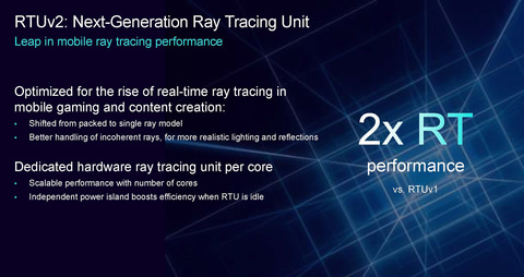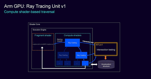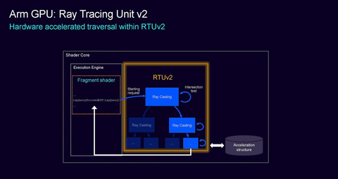 では、大きな強化点はどこなのかと言えば、それがImmortalis-G925で導入されたハードウェア・レイトレーシングユニット(RTU)が第2世代に進化していることだ。Armの従来のRTUでは、レイトレーシングの処理を行なう時にシェーダーエンジンの外側に用意されているRTUを利用して処理を実行し、その結果をシェーダーエンジンに返す仕組みになっていた。しかし、第2世代RTUではシェーダーエンジンの内部でレイトレーシング処理ができるようになり、同じレイトレーシングの処理でも実行効率が高まっている。これにより、RTUの性能は2倍に高まっている。