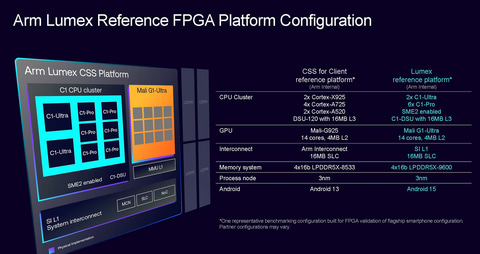 Lumexは、CPUクラスタがC1-Ultra(2コア)+C1-Pro(6コア)の8コア、GPUはMali G1-Ultra(14コア)、L3キャッシュ(SLC)は16MBとなる。それに対してCSS for Clientの方はCPUクラスタがCortex-X925(2コア)+Cortex-A725(4コア)+Cortex-A520(2コア)の8コア、GPUはImmortalis G925(14コア)、L3キャッシュ(SLC)は16MBという構成になっている。