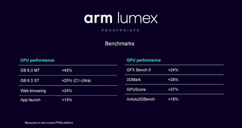 こうした設計を施した結果、Lumexの性能は従来のCSS for Clientに比較して大きく引き上げられている。Armでは、3nmのFPGAを利用して、仮想的にLumexとCSS for Clientを構成した場合のベンチマーク結果を公開している。