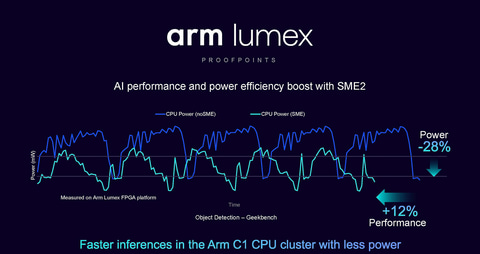 このように、LumexではCPUもGPUも、改良の効果で2桁パーセント以上の性能向上を実現しており、CPU/GPUの世代間進化としては十分な向上幅を実現している。さらに、CPUはSME2という新しい拡張命令セットに対応することで、最大5倍、平均して3.7倍の性能向上を達成し、かつ電力効率は3倍になっている。特にSME2を利用できるとその性能向上幅は大きなものがあると言えると思う。