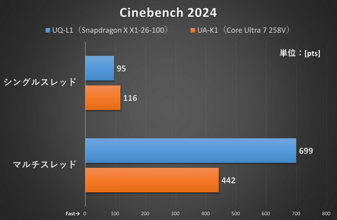 CPUに重い負荷をかけて、CPUのピーク性能を計測するCinebench 2024では、シングルスレッドはUA-K1(Core Ultra 7 258V)が速く、マルチスレッドはUQ-L1(Snapdragon X X1-26-100)が速いという結果になった。