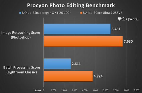 それでは、Snapdragon X搭載の試作機(UQ-L1)を、すでに発売済みのCore Ultraシリーズ2(Core Ultra 7 258V)を搭載した製品(UA-K1)と、ベンチマークで比較してみよう。なお、UQ-L1の方はほぼ最終版に近いが試作機なので、実際の製品とは異なる可能性があることはお伝えしておく。