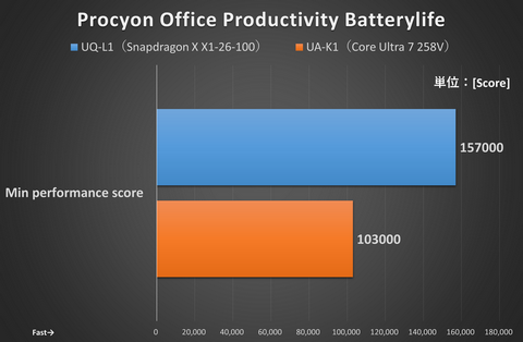 Microsoft 365アプリ(Word、Excel、PowerPoint、Outlook)を利用してバッテリ駆動時の性能とバッテリ駆動時間を計測する「Procyon Office Productivity Batterylife」では、UQ-L1(Snapdragon X X1-26-100)がUA-K1(Core Ultra 7 258V)をバッテリ駆動時間でも、性能でも上回った。