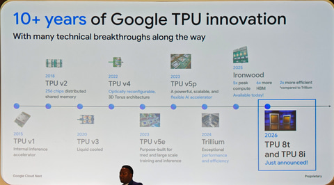 Alphabet傘下のGoogle Cloudは、4月22日から4月24日にかけて米ラスベガスにて開催中の年次イベント「Google Cloud Next '26」において、AI演算向けのTPU(Tensor Processing Unit)の第8世代製品となる「TPU 8t」、「TPU 8i」の2製品を発表した。