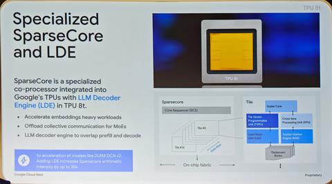 もう1つのTPU 8tの大きな強化点は、Sparse Coreと呼ばれる、データの処理をオフロードするための特殊なアクセラレータが、新しくLLM処理時のアクセラレーションに対応していることだ。LDE(LLM Decoder Engine)と呼ばれる機能がそれで、